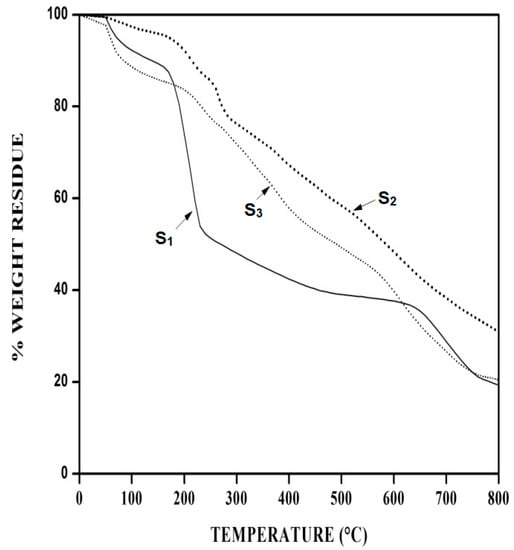 The traces of TGA and DTG for Na–PCMSA (S1), Na–PCMSA–g–PAN (S2), and the superabsorbent hydrogel, H–Na–PCMSA–g–PAN (S3) samples are represented in Figure 4. Thermogravimetric data derived from these traces for all three samples are also tabulated in Table 1. It becomes evident from the TGA trace of Na–PCMSA (S1) that the decomposition process occurred in three stages. The one in the range of temperature 50–100 °C corresponds to the evaporation of water (7.19% weight loss). The major weight loss (40.64%) took place in the temperature range 135.95–280.85 °C (second step of decomposition). The DTG of Na–PCMSA also exhibited the temperature for the maximum decomposition for this stage at 212.88 °C. Beyond 280.85 °C, the sample degrades very slowly up to 552 °C, and, thereafter, it degrades with a maximum weight loss at 701.51 °C involving about 19.35% weight loss. The final decomposition temperature (FDT) was found to be 796.53 °C.