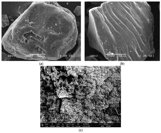 Scanning electron micrographs of (a) Na–PCMSA ( = 1.10) (500×), (b)Na–PCMSA–g–PAN (%G = 316.53) (500×), and (c) the superabsorbent hydrogel H–Na–PCMSA–g–PAN (500×).