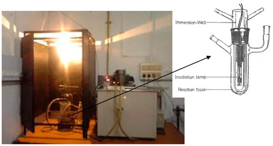 Photo-chemical reactor supplied by Scientific Aids and Instruments Corporation (SAIC, Madras, India) was used to prepare the photo-induced graft copolymer Na–PCMSA–g–PAN []. A known amount of Na–PCMSA (0.2–3.0 g, dry basis) dissolved in low-conductivity water (in such a way that the total volume of the reaction system remains 150 mL), and the solution was stirred at 35 °C for an hour, followed by 20 min stirring at room temperature. Freshly prepared CAN solution (0.5 × 10−3–10.0 × 10−3 mol/L) in 10 mL nitric acid (Nil-0.5 mol/L) was added to the reaction flask, and contents were then flushed with purified nitrogen gas for half an hour, followed by an addition of known concentration of freshly distilled AN (0.051–0.506 mol/L). The reaction flask in the photo-chemical reactor was irradiated with a 125 W medium-pressure mercury lamp with a continuous flow of nitrogen gas and stirring for different time intervals (0.5–10 h) in the temperature range of 15–45 °C. After the stipulated time, the crude product was isolated by centrifugation and then purified by washing with dilute nitric acid as well as 95% methanol and finally washed with pure methanol. The crude copolymer of Na–PCMSA–g–PAN obtained was dried under vacuum at 40 °C. Figure 6 shows the photograph of the complete experimental setup for carrying out the photo-grafting reaction.