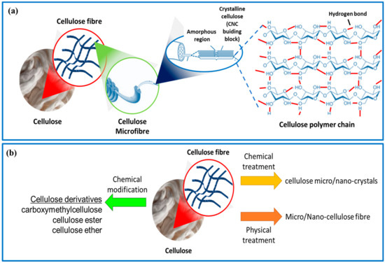 (a) Morphology illustration of plant cellulose fibers and their molecular structure. (b) Schematic of the preparation of cellulose micro/nano-crystals/fibers and derivatives.