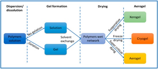 Drying is the process by which liquid from within the gel is removed without causing substantial damage to the gel’s microstructure; multiple drying procedures are able to be performed based on the type of spherical gel and its mechanical stability [32]. The appropriate drying technologies are the most important step in the fabrication of aerogels and can be accomplished in a number of ways, the most common of which are evaporative drying, freeze-drying, and supercritical drying, which will result in the formation of xerogels, cryogels, and aerogels, respectively. Among these three, aerogels have the largest pore structure, followed by cryogels and xerogels [46].