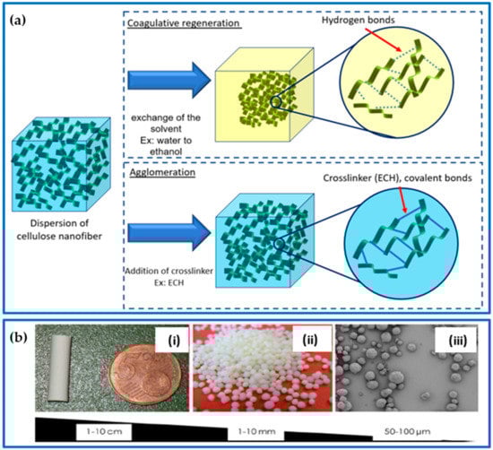 (a) Cellulose aerogel gelling approach: coagulative regeneration and chemical agglomeration. (b) Different forms of cellulose aerogels: (i) monolith, (ii) beads, and (iii) microparticles; adapted from [39,40,41].