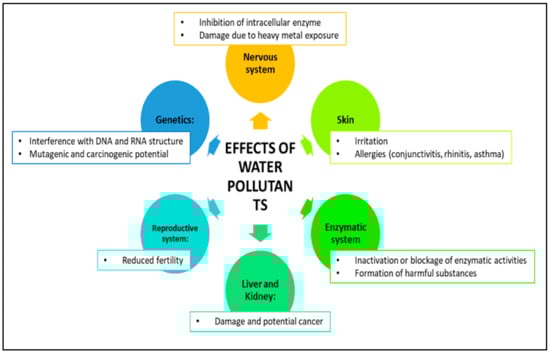 Water pollution is a significant problem caused by human activities such as factories, farming, and technology, and it can be harmful to both the environment and people’s health [65]. Pollutants come from various sources, including heavy industries, electronics, textiles, food production, housing, pharmaceuticals, hospitals, mining, and agriculture (Figure 5). These pollutants can be organic or inorganic and can cause health problems such as skin irritation and respiratory issues. They can also disrupt ecosystems, harm animals and humans, and cause chronic conditions [2,66]. Exposure to pollutants can have long-term negative effects on individuals and communities. Water pollution can also reduce biodiversity, negatively impact fishing and agriculture, and make drinking water unsafe. To protect the health of all living beings and our planet’s sustainability, it is essential to take measures to reduce the levels of pollutants in the environment. Dyes and heavy metal pollution in drinking water sources pose a major threat to public health and the environment. These pollutants can be toxic, cause cancer, and upset the natural balance of microbial populations in water, causing serious ecological damage [66]. Inefficient water treatment can release pollutants that harm the environment and living organisms. In developing countries, farmers may use wastewater to irrigate crops, negatively affecting soil quality and crop growth. These chemicals can build up in organisms and enter the human body (Figure 5) through food, water, air, and the skin, causing various health issues with prolonged exposure [67]. To address this issue, researchers are developing new methods and materials to effectively remove these harmful pollutants from water sources. This ongoing research is crucial to safeguarding the health of communities and ensuring the sustainability of our planet.