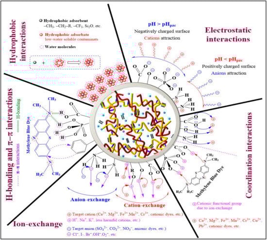 Hydrogen bonding is a type of dipole–dipole interaction between a positively charged hydrogen atom and a more electronegative atom (e.g., N, O, F, etc.) or group. It plays a crucial role in treating dye-containing wastewater, where functional groups in the adsorbent molecule participate in hydrogen bonding with pollutants. Researchers have developed eco-friendly CMC nanofiber hydrogels that can remove several chemical dyes via hydrogen bonding, electrostatic interactions, and hydrophobic interactions [99]. Hydrogen bonding interactions between sulfur atoms in both anionic (acid blue 93) and cationic (methylene blue) dyes and hydrogen atoms in aerogel material have been extensively explained [100]. Therefore, hydrogen bonding offers promising opportunities for developing effective adsorbents to remove pollutants from wastewater.