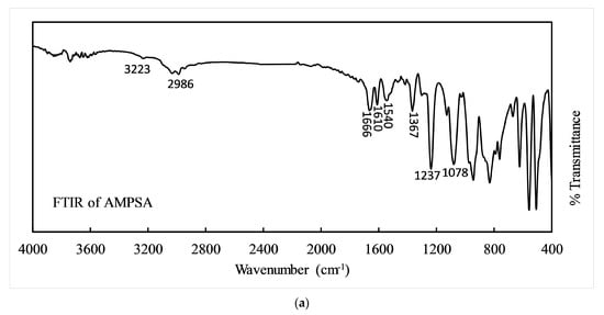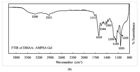 To clarify the existing functional groups in the polymeric gel and to confirm the polymerization, FTIR spectra were carried out with KBr calibration and presented in Figure 3. Davide Ferri et al. reported on the characteristics of FTIR peaks of DMAA []. Here, the FTIR spectra of AMPSA and gel are presented and analyzed to confirm the copolymerization. Figure 3a shows the FTIR of pristine AMPSA powder, where peaks at 3223 cm−1 and 2986 cm−1 are for –N–H and –C–H stretching vibrations. The characteristic peaks at 1666 to 1610 cm−1, 1540 cm−1, 1367 cm−1, 1237 cm−1, and 1078 cm−1 are attributed to carbonyl (–C=O) stretching of –CONH-, –N–H bending, –C–N stretching, and symmetric and asymmetric peaks of the sulfonic acid group explained in gels spectrum []. Due to copolymerization, the strength of peaks may change to some extent. In Figure 3b, the peaks at 3290 cm−1 and 2921 cm−1 are for the –O–H stretching overlap with the –N–H peak and –C-H stretching of the carbohydrate chain. The peaks at 1717 cm−1 and 1610 cm−1 are attributed to –C=O stretching of carboxylic acid (–COOH) and acyl amino (–CONH-) groups, indicating the presence of DMAA and AMPSA. The characteristic peaks at 1363 cm−1, 1209 cm−1, 1149 cm−1 (strong band), 1105 cm−1, and 1035 cm−1 (strong band) correspond to –C–N stretching, asymmetric stretching of -SO2, symmetric stretching of –SO2, –SOH stretching, and –S–O stretching of –SO3H []. Therefore, FTIR confirmed the polymeric hydrogel formation between DMAA and AMPSA.