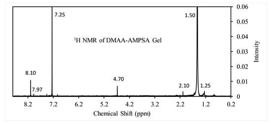 Proton nuclear magnetic resonance (1H NMR) spectrum of gel carried out in chloroform solvent to observe the different environments of the proton. 1H NMR spectrum supports the other analysis methods in confirming the formation of hydrogel networks. In Figure 4, hydrogel displays the following corresponding signals [,]: the peak at 1.25 ppm corresponds to methyl (–CH3) proton (carbon no. 9,10,11,12); at 2.10 ppm for –CH- proton of (carbon no. 3, 5); at 4.70 ppm for –CH2– (carbon 4, 8). The proton of –NH and –COOH show strong peaks at 7.25 ppm and 8.10 ppm. Thus, the 1H NMR supports the FTIR in confirming the polymerization between DMAA and AMPSA.