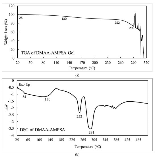 Thermoanalytical technique differential scanning calorimetry (DSC) and thermo-gravimetric analysis (TGA) were carried out for the DMAA–AMPSA hydrogel prepared by applying a 10 kGy radiation dose shown in Figure 6. As a function of temperature, the DSC reflects the difference in heat flow between the sample and inert reference, where the TGA depicts the changes in sample weight. In Figure 6a—TGA graph—there are four stages of temperature changes. First, from 25 °C to 130 °C for dehydration; the second one is from 130 °C to 252 °C for changing to a glassy state; the third part is from 252 °C to 290 °C for melting, and the final stage is above 290 °C temperature; random changes in the graph indicate the degradation into other compounds which are explained in DSC. Elizabeth Elgueta et al. found similar TGA analysis results regarding the degradation of AMPSA-based gels []. In Figure 6b, the DSC thermogram depicts the initial decline of the graph, indicating the dehydration from the gel at around 54 °C, and the glass transition temperature (Tg) is at 130 °C, which resembles the TGA graph demonstrating weight loss of up to 5% at the same temperatures. The melting temperature (Tm) of the gel that appeared in the DSC graph is 252 °C, corresponding to the almost unchanged weight in the graph of the TGA. The last peak of DSC is at 291 °C; this temperature can be attributed to the evaporation of water due to the degradation of gel into new products/volatile compounds. The TGA graph clearly supports the situation at 290 °C by exhibiting drastic weight loss changes []. Above 291 °C, there is no smooth peak which indicates the degradation of the gel into smaller molecules. From both types of thermal analysis, it can be concluded that the prepared hydrogels are stable enough to use at room temperature.