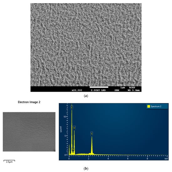 SEM-EDS is a sophisticated qualitative analysis technique where the secondary and scattered electrons give rise image of the surface, and the X-ray detects elements present on that surface []. To investigate the surface nature and constitutional elements of the hydrogel, SEM-EDS was performed, as shown in Figure 7. Figure 7a exhibits the entangled surface morphology of the dry gel. There are pores in the structure where it can uptake solvent (water) as well as be capable of adsorbing other materials such as metal ions, dyes, and drugs. Figure 7b is clearly representing the elements carbon (C), nitrogen (N), oxygen (O), and sulfur (S) (Table 2), which consist of the polymeric gel. Therefore, the functional groups containing the above-mentioned elements, as well as carboxylic acid, amide, and sulfonic acid, are present in the polymer, which also supports FTIR and NMR analysis [].