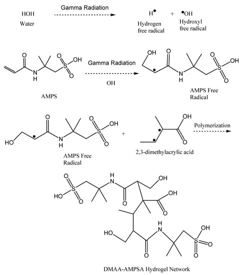 Gamma radiation is a highly energetic electromagnetic radiation capable of producing free radicals from vinylic organic monomers []. The gamma-radiation-induced polymerization was explained in detail by J. M. Rosiak and P. Ulanski []. Esmaiel Jabbari et al. also described the y-radiation cross-linking of polyacrylic acid in an aqueous solution []. Here, the probable reaction mechanism is explained shortly. Copolymerization between DMAA and AMPSA was performed by free radical polymerization in an aqueous blend solution containing no initiator and the cross-linking agent. Both the DMAA and AMPSA possess a vinylic part in their structure which can be turned into free radicals upon irradiating gamma rays. First, the water molecule undergoes hydrogen and hydroxyl free radical formation upon gamma-ray irradiation, where the two hydrogen-free radicals combine to produce hydrogen gas and escape. Then, the hydroxyl free radicals combine with AMPSA to produce their own free radicals at the adjacent pie bond point []. The free radicals propagate and terminate to produce the final product hydrogels. Scheme 1 represents the probable free radical mechanism of hydrogel formation. Since there is no external cross-linking agent added, the smaller monomer DMAA may act as a self-cross linker between two copolymer/homopolymers of DMAA and AMPSA, followed by the formation of the final product.
