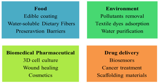 It has been established that alginate is biocompatible and non-toxic, making it ideal for usage in the food sector as an intensifier for a variety of applications, including salad dressings [163]. Alginate gels are non-invasive and can be injected orally for administration [34]. They can also be altered to increase the controlled release of macromolecules. Due to its superfine gelation technique, low cost, and recent relocation, research on alginate has recently shifted toward tissue engineering applications [163,164,165]. Alginate hydrogels are frequently employed in cell transplantation since they are biodegradable and simple to interact with [165]. In addition to neural stem cells, articular chondrocytes, skeletal myoblasts, and mouse embryonic stem cells in alginate gels may be employed to culture several distinct kinds of cells. The use of 3D scaffolds as part of a tissue engineering strategy for cell and tissue culture is becoming recognized as the most effective way to generate results in in vitro culture models that are predictive of in vivo conditions. A polysaccharide generated by brown algae with a linear structure, called alginate, has various desirable properties that make it a good candidate for use as an extracellular 3D matrix in tissue models and in vitro cell cultures. Hydrogels can encase tissues and cells extensively when exposed to a divalent cation because they can create intimate crosslinkages with the ions in their vicinity [166,167]. The alginate hydrogel can be biologically changed to facilitate specific interactions between adjacent cells or tissues, or it can be left undisturbed to provide mechanical support for tissue morphogenesis and/or biological reactions. Investigators have employed alginate hydrogel to develop a double system of cultural separation that interacts as a targeted approach to generate operational and developmental in vitro models [168]. Figure 4 provides an overview of the applications for materials based on alginate.