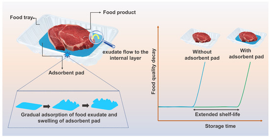 Bio-based polymeric hydrogels represent a promising area of research in addressing the problem of plastic waste in the food packaging segment and have become an increasingly prevalent area of research in recent years, particularly as a potential alternative to traditional petroleum-based plastics [5,6]. Unlike conventional synthetic hydrogels, which can take hundreds of years to decompose and can release harmful chemicals into the environment, bio-based polymeric hydrogels are designed to be biodegradable and environmentally friendly [7]. In general, such natural hydrogels are primarily made from proteins, lipids, and polysaccharides that come from renewable sources like plants or animals, and they are favored because of their availability, biodegradability, biocompatibility, and lack of toxicity [8,9]. These natural polymers are then chemically modified to form hydrogels, which are remarkably absorbent and can be molded into a wide range of shapes and sizes. Essentially, hydrogels are distinguished by their high water-absorption capacity and ability to retain structural integrity even when fully swollen [8]. Therefore, hydrogels are appropriate for use in applications for food packaging due to these characteristics. Controlling the humidity that results from high-water-content food is a potential application for hydrogels in food packaging. By incorporating hydrogels into the packaging material, the hydrogels can absorb excess moisture and maintain an appropriate moisture level as well as reduce the water activity (aw) of the product, which can inhibit the growth of microorganisms that cause spoilage and extend the shelf life of the food [10]. In order to preserve the freshness and shelf life of the product, Figure 1 shows a graphical illustration of this packaging and the swelling process of hydrogel-based food packaging. This illustration depicts a simulation of the exudate flow from food packages to the internal layer (hydrogel), gradual exudate adsorption in the adsorbent pad, and hydrogel swelling, taking the design of the adsorbent packaging system into account. In addition, Figure 1 demonstrates the way the application of packaging made of a hydrogel influences the rate at which food quality degrades over time. It illustrates the comparative advantages of various packaging strategies including the application of hydrogel coatings, films, or indicators. When hydrogel-based packaging is used instead of traditional packaging approaches, the graph shows a reduced rate of food quality reduction as the storage time increases. Furthermore, by integrating functional materials such as antimicrobial agents or oxygen scavengers, hydrogels can be used as active packaging [11,12,13]. These functional materials can be embedded within the hydrogel matrix and slowly released over time, assisting in the preservation of food quality and freshness.