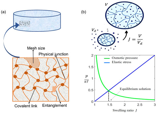 Structural chemistry of a hydrogel: (a) structure of a hydrogel at the molecular level; (b) correlation of the swelling ratio of the hydrogel with osmotic pressure and elastic stress. Adapted with permission from [56]. Copyright © 2021 American Chemical Society.