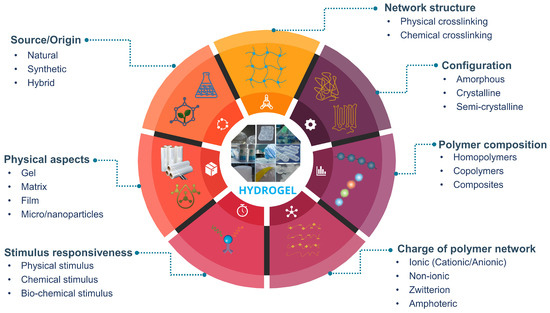Although hydrogel classification can be complex and multifaceted, as different criteria may be relevant for different applications, a systematic understanding of hydrogel classification is vital since it offers a framework for understanding and selecting hydrogels with specific properties and applications. Hydrogel classification, for example, is critical for optimizing hydrogel performance in packaging applications by selecting or designing hydrogels with application-specific properties such as high-water absorption capacity, biocompatibility, and the ability to form a barrier against gases and vapors. Various classification criteria can be employed to discern the difference between hydrogels. These can be categorized as renewable or non-renewable based on their sources, which differs from a classification system that depends on their origin (natural and synthetic). Other hydrogel classifications include network structure, configuration, polymer composition, polymer network charge, stimulus responsiveness, and physical aspects [14,36,74], which are depicted schematically in Figure 3.