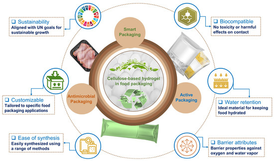 Regarding the configuration of hydrogel matrices, a shift toward bio-based hydrogels from an extensive range of natural sources such as cellulose, starch, chitosan, and gelatin as alternatives to synthetic compounds (polyacrylamide, poly(acrylic acid), poly(sodium acrylate), and polyvinylpyrrolidone) has been explored in recent years due to the need for more sustainable and eco-friendly packaging solutions [8,14,15,16]. Among these biopolymers, cellulose and its derivatives have emerged as a popular choice for hydrogel production due to their abundance and renewability. Essentially, cellulose is a polysaccharide composed of a linear chain of β-(1→4)-linked D-glucose units that assists as the main structural component of plant cell walls and is the most abundant renewable resource on the planet. In recent years, considerable attention and research have been devoted to investigating the potential of CBHs for various applications including food packaging [12,17,18,19]. Cellulose and its derivatives are ideal materials for hydrogel production in food packaging due to its numerous advantageous properties including cost-effectiveness, moldability, water absorption, swelling ability, stimuli responsiveness, biocompatibility, and biodegradability. Furthermore, cellulose and its derivatives are versatile materials that provide substantial mechanical strength, excellent thermal stability to withstand high temperatures without degrading, and act as an ultraviolet ray protector due to their ability to absorb and scatter UV radiation [20,21,22]. However, pure cellulose-based hydrogels typically lack flexibility and functionality, limiting their wide range of applications. This is due to the fact that cellulose is a rigid and crystalline material that forms strong hydrogen bonds between the glucose units, resulting in a highly ordered and inflexible structure [23,24].