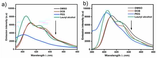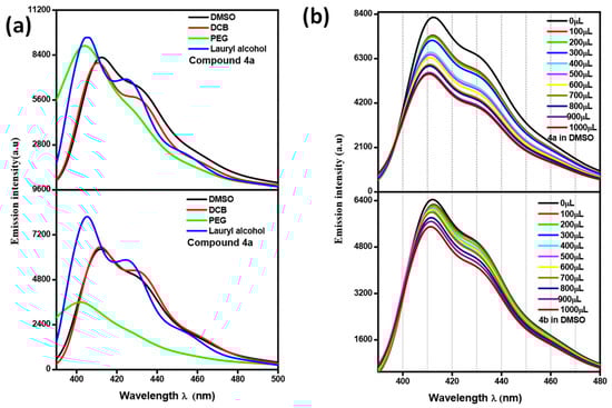 Emission spectra displaying a varying degree of solute-solvent interactions (a,b) 4a and 4b DMSO, 1,2-dicholorobenzene, polyethylene glycol, and Lauryl alcohol respectively.
