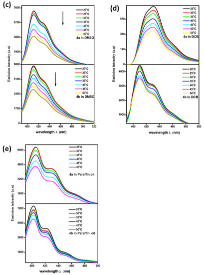 Fluorescent gels, either as a standalone system or as light-emitting materials embedded in a gel system, can be used for sensing chemical or gas detection in minute quantities. The incorporation of highly conjugated moiety into the gelator skeleton is considered an important criterion to allowing electronic applications, such as sensors, optical, electrical memory, and display devices. In addition, the fluorescence emerging from such conjugated systems can also be used to act as an imaging agent in biomedicine. It is well known that during the process of molecular self-assembly, morphology is influenced by intermolecular and gelator-solvent interactions []. Even though FTIR and XRD studies could be able to provide deep insight into intermolecular interactions and molecular packing, emission studies further provide the details of gelator–solvent interactions and the existence of π-π staking [,]. To identify the response of the gelator in different gelling solvents, we recorded emission spectra for 4a and 4b in lauryl alcohol, PEG, DMSO, and dichlorobenzene (Figure 5a). Compounds 4a and 4b in DMSO at a 1 × 10−5 M concentration displayed an emission at 413 nm, which, upon sequential dilution with DMSO followed by sonication, displayed a hypsochromic shift (Figure 5b). When moving from the solution state to the assembled state, a bathochromic shift was observed (red shift), which is a consequence of the J-type π-π interaction that occurred in the assembled state and increased the molecular order. After obtaining exciting fluorescence results, we were curious to identify whether such J-type aggregation exists in the gel formed by the gelator in various solvents or not. The fluorescence spectra of 4a and 4b, recorded at variable temperatures in various solvents, such as DMSO, DCB, and paraffin oil, displayed a clear hypsochromic shift, which provides clear evidence for the disassembly of J-type aggregation (Figure 5c–e).