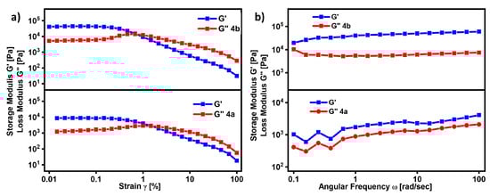 The dependence of G′ and G″ of gels formed from 4a, 4b in lauryl alcohol in (a) strain amplitude and (b) angular frequency.