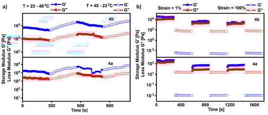 The mechanical properties were investigated by studying the viscoelastic properties of the gel formed by 4a and 4b in lauryl alcohol using a rheometer. Owing to the dependence of the gel deformation in response to stress or strain, with the nature and extent of intermolecular interactions causing supramolecular arrangements, flow characteristics are generally studied by measuring the strain amplitude sweep and angular frequency sweep necessity of gels with respect to storage modulus G′; this denotes the ability of the deformed gel to restore its original state (elastic nature) and loss modulus G″, which denote the flow characteristics of the gel []. Figure 7 shows the measurements of the strain amplitude and angular frequency dependence of the G′ and G″ of the gels formed from 4a and 4b in lauryl alcohol. Throughout the entire range of the frequency sweep measurements of these gels (4a and 4b), the G′ was found to be greater than the G″ (Figure 7). This result revealed that these gels were stable and possessed a good tolerance to external forces. The amplitude sweep measurements clearly showed that both of these gels exhibited solid-like behavior up to a critical strain level γc; at critical strain, a cross-over occurred between G′ and G″, after which both G′ and G″ decreased, indicating the flow characteristics of these gels. The γc for the gel formed from 4a was 1.47% (G′ = G″ = 2802.7 Pa) whereas that for 4b was 0.68% (G′ = G″ = 14,898 Pa). After identifying the potential of the gel to withstand external forces, the processability of the gels was examined by performing continuous temperature ramp-up and ramp-down experiments between 23 °C and 45 °C. Figure 8a indicates that these gels dissemble upon heating and regain the gel network upon cooling through reversible non-covalent interactions, confirming the thermo-reversible nature of these gels. Generally, the thixotropic nature of gels gives an idea about their ability to regenerate the structural integrity which was lost upon the application of varying strains to the gel [,,]. Upon applying a constant strain of 100%, the gels from 4a and 4b became thinner; after reducing strain to 0.1%, the viscosity of the gels were reset to their initial state. We performed three cycles of continuous strain ramp-up and ramp-down experiments and observed the loss of structural integrity of the gel material with the increasing strain and the immediate recovery of the original state upon strain relaxation to 0.1% (Figure 8b) [,,,].