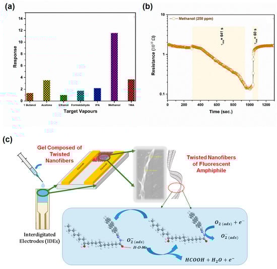 After establishing the molecular-level self-assembly mechanism, potential applications of the assembled materials were identified by performing sensing studies. Recently, the development of sensors to detect the presence of various harmful gases has been one of the most interesting areas of research. To investigate the gas-sensing behavior, sensing elements were prepared by drop casting the twisted fibers prepared from 4a and 4b on commercially available gold interdigitated electrodes (Ref. No.: P-IDEAU100, DropSens, Spain), followed by air-drying them at room temperature. The gas-sensing studies were performed using the custom-made gas-testing chamber reported on in our previous work [,,]. The prepared electrode consisted of two interdigitated electrodes with two contact tracks. For sensors studies, twisted fibers derived from 4a and 4b, of concentration 1.0% w/v, were systematically coated on electrodes; sensing behavior was investigated using a high resistance electrometer (Keithley 6517B, USA) intergraded with a homemade chemical/gas-testing chamber []. In order to attain the precision of the fabricated sensor device, maintaining the gelator concentration of 1% w/v was crucial because the change in gelator concentration may have affected the porosity of the gel network, which would directly reflect on the sensor characteristics. Preliminary toxic gas-sensing studies revealed that the electrode decorated with the twisted fibers of 4a was encouraging; hence, we selected the 4a-coated electrode to use in investigating selectivity and sensitivity. The utility of assembled organic materials in vapor sensing is highly promising because of enhanced electron transport, facilitated ion transport, and versatile building blocks. Selectivity is one of the essential parameters for showing the ability of the device to identify the particular analyte, either in liquid or gaseous samples. Therefore, sensing elements fabricated from 4a were examined in terms of different analytes and the sensing response was overserved via 250 ppm of 1-butanol, acetone, ethanol, formaldehyde, isopropanol (IPA), methanol, and trimethylamine (TMA). The sensor fabricated from 4a displayed a selective response towards methanol over other target analytes (Figure 9a); this might be due to the diffusion and interaction of methanol, rather than the other target gases, as displayed above. It is worth mentioning that the fabricated sensor displayed a considerable response towards acetone and trimethylamine, rather than showing a response for the analogous molecules, such as ethanol and 1-butanol, which clearly revealed that in addition to pore aperture, the nature of the interaction was also an important phenomenon in the sensing response.