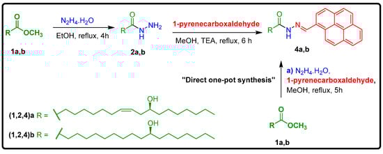 Synthesis of pyrene-appended ricinolyl hydrazone, 4a and 4b.
