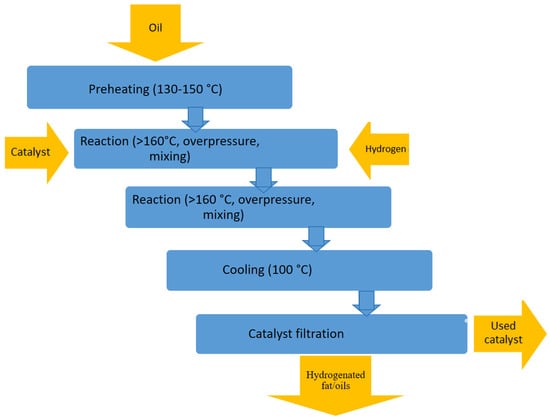 Hydrogenation (HG) is a process aimed at changing the functional properties of liquid lipids. There are three types of HG, i.e., full HG, partial HG or partial HG without hardening []. HG leads to the production of solid or semisolid (plastic) fats from the oil. In the HG process, unsaturated FAs are converted into saturated fatty acids and TFAs. It is also possible to obtain oil with increased oxidative stability. An example of a hydrogenation process is shown in Figure 1. The high moisture of the oil has an adverse impact on the process. It may cause hydrolysis, which, in effect, forms free fatty acids. Under hydrogenation conditions (i.e., with high temperatures and a nickel catalyst), these compounds are saponified, which is why oils are dried before or after insertion in an autoclave. At the beginning of the HG process, oil is heated to 140 °C, the starting temperature of the HG reaction. The desired reaction can proceed at different temperatures, depending on the oil type and inhibition level of trans fatty acid formation [,,].