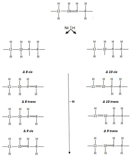 Large amounts of TFAs are produced in the partial hydrogenation process. The mechanism of their formation, e.g., for oleic acid, is shown in Figure 2. From one cis isomer (oleic acids—C18:1c), several different geometric isomers are formed, chiefly elaidic acid (C18:1t). The TFA content in partially hydrogenated oil depends on the process parameters, i.e., temperature, hydrogen pressure, time, catalyst type, and concentration. The process of total hydrogenation leads to the complete saturation of unsaturated bonds and the formation of SFA, and oleic acids are transformed into stearic acid [,,].