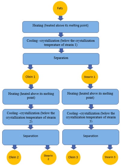 - Dry fractionation (named crystallisation from the melt) is fractional crystallisation in this simple form. It is an economic and ecological technique [,]. This modification is a cheaper process than hydrogenation or interesterification [,]. The principle of dry fractionation is simple. The fat to be fractionated is heated above its melting point. Then it is cooled to the separation temperature, and the fractions are separated from each other. The cooling rate depends on the characteristics of the end products. The crystal mass (stearin) suspended in the oil is separated, which must be performed quickly to avoid partial remelting of the crystals. In large fractionation lines, crystal nuclei are formed in a precooling step in a big vessel that feeds several small vessels (crystallisation vessels) where the crystals are allowed to grow. Thus, one achieves higher efficiency by separating the sensitive step of nucleus formation from the time-consuming step of crystal growth [,].