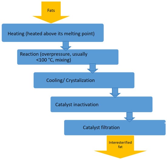Interesterification is a process in which the composition of the acids does not change, except for their arrangement in the triacylglycerol molecules. This process can ensure uniform properties of finished fats even if the composition of the raw material is subject to wide variations [,]. Interesterification can be conducted in a batch or continuous mode. In a batch process, the raw blend (oil/fats) is heated to 120–150 °C under a vacuum to remove moisture. After the drying step, the blend is cooled to 70–100 °C. The interesterification reaction then proceeds for 30–60 min. After the reaction, the catalyst is neutralised, and the filtration process product is ready to be bleached and deodorised []. A diagram of an interesterification is shown in Figure 4.