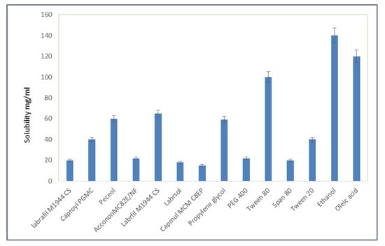 The saturation solubility studies of mirtazapine were carried out in different solvents. Oleic acid was selected as the oil phase from the solubility studies (Figure 1) based on the drug’s solubility, and Tween 80 and ethanol were selected as the surfactant and co-surfactant, respectively. Tween 80 not only effectively dissolves drugs but also effectively forms emulsions.