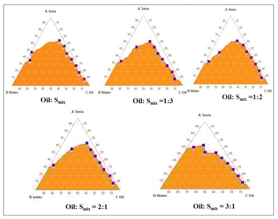 Oleic acid was chosen as the oil phase, Tween 80 as the surfactant, and ethanol as the co-surfactant based on the solubility experiments. Tween 80 and ethanol were measured in the weight ratios (1:1, 1:2, 1:3, 2:1, and 3:1) of surfactant to co-surfactant (Smix). The pseudo-ternary phase diagrams were produced at room temperature by the water titration method. For each pseudo-ternary phase diagram, oil and Smix mixtures were created with weight ratios (w/w) of 1:9, 2:8, 3:7, 4:6, 5:5, 6:4, 7:3, 8:2, and 9:1. When the combination reached a particular point and began to break down into a macroemulsion, double-distilled water was gradually added to each ratio of Smix to oil while the mixture was being stirred magnetically. In order to complete the pseudo-ternary phase diagrams, the component concentrations were noted. The oil, surfactant, co-surfactant, and water contents were then chosen at the proper weight ratios based on the stability and transparency of the resulting microemulsions [,].