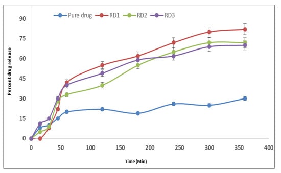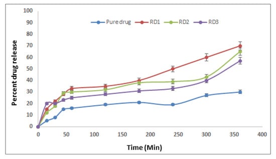 For the created formulations, in vitro release tests were carried out utilizing Franz diffusion cells and diffusion experiments. The study was carried out for up to 6 h for developed thermotriggered nanoemulsion (RD1), mucoadhesive nanoemulsion (RD2), and water-based nanoemulsion (RD3). The results are graphically represented in Figure 3. It can be observed that optimal formulation, i.e., thermotriggered nanoemulsion (RD1), has shown 71.42% drug release after 6 h, whereas mucoadhesive nanoemulsion (RD2) and water-based nanoemulsion (RD3) showed drug releases of 66.12% and 60%, respectively, after 6 h. This indicated that the thermotriggered nanoemulsion (RD1) was better among the three formulations. The high release may be because of the poloxamer 407, which is helping the formulation to form in situ gel as soon as it is sprayed in the nose, while the mucoadhesive properties of carbopol are keeping the nanoemulsion adhered to the mucosal lining. Formulation RD2 lacks poloxamer 407, hence it doesn’t get sufficient time for contact with the mucosal area and drains. The least release with RD3 formulation is due to the absence of a mucoadhesive polymer as well as a thermosensitive polymer.