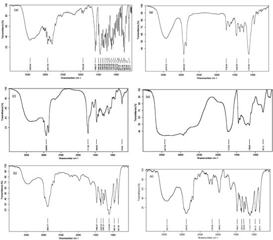 IR Spectra of (A) mirtazapine, (B) formulation, (C) oleic acid, (D) Carbapol934P, (E) poloxamer 407, and (F) PEG 6000.