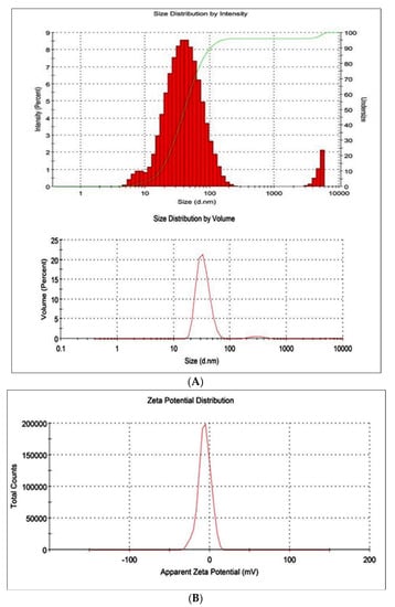 Using the zetasizer, a dynamic light scattering or photon correlation spectroscopy technique was used to measure the mean droplet size and zeta potential (Malvern Instruments version 7.01). Using filtered, twice-distilled water, each was diluted to the proper concentration. Analysis of globule size was carried out at 25 °C and with a detection angle of 90 °C. Nanoemulsions’ size and polydispersity index were directly measured by the equipment [,,].