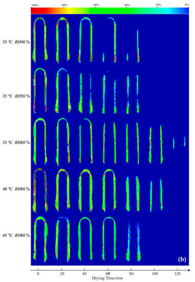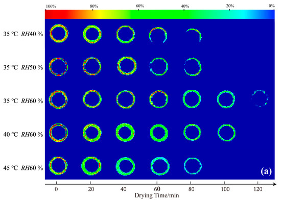 It is evident that the initial colors in the middle layer of all capsules are almost red, an indication that the initial moisture content under different drying conditions is the same. As drying time increases, the moisture percentage continuously decreases (green area increases), indicating a decreasing trend of the moisture content of the capsule with time. After 60 min, the moisture percentage distribution in the cross-sectional capsule shell gradually becomes more uniform, an indication of even moisture distribution and that the inner moisture of the capsule is transferring to the surface of the capsule. At the end of the drying process, the contour of the capsule becomes more blurred, and the moisture percentage equals 0% after 80 min, indicating that the majority of moisture has evaporated and that only the bound water possibly leaves [28,30]. Meanwhile, in the vertical sectional MRI images, it is obvious that the moisture percentage signal first disappeared at the elbow of the capsule, attributed to the thinnest in this part and finally at the broadside part. The signal lastly disappears at the bottom of the capsule. This is probably because the thickness of the bottom is larger than other parts of the capsule, attributed to the effect of gravity, which results in the collection of some mixture solution and calcification solution at the bottom part. Noticeably, slight variations in the overall color of the capsules are observed among the slices under different drying conditions at 0 min. This phenomenon could be attributed to the positioning of LF-MRI, the selection of LF-MRI images, and potential errors in the preparation process. However, the results of quantitative detection verify that the initial moisture content of each capsule is consistent throughout, with an average deviation of less than 5%.