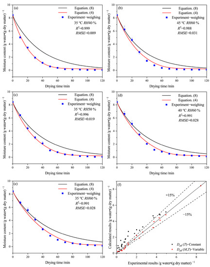 Figure 2 illustrates the effect of drying conditions on the moisture content of HPMC-based hard capsules based on the experiments and drying mathematical models with variable (Equation (4)) or constant (Equation (8)) Deff, as well as a comparison between these results. It is evident that the calculated results at variable Deff are in better agreement with the experimental results obtained by the weighing method than those using constant Deff. Furthermore, the difference between the two calculated results becomes more significant with time. The moisture content decreases rapidly from 8.44 to 0.5 g water·(g dry matter)−1 with time until the 80th minute and then slowly decreases from 0.5 g water·(g dry matter)−1 to the equilibrium moisture content. The drying rate is slower at lower temperatures or higher relative humidity, and it takes longer to reach the equilibrium moisture content. There are some deviations between the calculated results of Equation (4) and the experimental results before 30 min, with relative errors under 15%. This deviation may be due to the assumptions of uniform temperature distribution and temperature equivalence of hot air and the sample since there may be a temperature difference between them at the early stage of the drying process [31]. As the drying time increases, the prediction results of Equation (4) become more accurate, indicating that the changes in the internal structure of capsules caused by a decrease in moisture content directly affect the effective moisture diffusivity. Figure 2f shows that the experimental value for the average moisture content of the capsule has good agreement with the ones calculated with Equation (4), with an error of around 15%.
