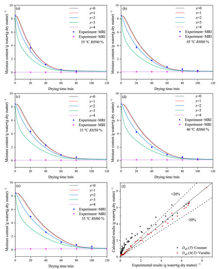 The drying curves in the x = 0 and x = 1 layers are relatively close, particularly at 35 °C and RH 40% or 45 °C and RH 60%. However, the gap between the x = 2 and x = 3 curves increases as the temperature decreases or the relative humidity increases, indicating that moisture concentration differences become larger at lower temperatures and higher relative humidity. The increased gap may result from a reduction in the transfer rate of moisture from the inside layer to the outside layer, which leads to a reduced average value of Deff-avg. Figure 4f provides evidence that Equation (4) can be used not only to estimate the mean moisture content but also to predict the moisture content at each layer of the capsule, with an error of approximately 20%.