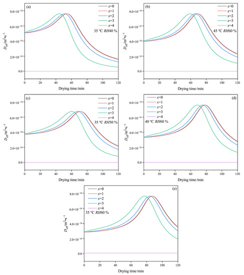 Figure 5 presents the effect of drying conditions on Deff at each layer, with consistent variation patterns throughout the drying period. It has been noted that Deff relates to moisture content during the drying process. The polysaccharide structure of the capsule affects the connection between molecules and moisture, and the transfer of moisture may also affect the physical structure of the capsule [38]. At the initial drying stage, just before Deff reaches its maximum, the value of Deff at the outside layer is larger than that at the inside layer. However, the comparison result becomes the opposite when the value of Deff reduces. This can be attributed to the fact that at the early stage of drying, the moisture on the outside layer, which has a larger contact area with hot air, easily evaporates to the hot air, while the moisture on the inside layer should mainly transfer onto the outside layer via liquid diffusion. At the late drying stage, the content of water connected to polysaccharide molecules may become smaller from x = 0 to x = 4, leading to a lower Deff. In this case, the small amounts of bound water are likely to evaporate, resulting in a slow drying rate at the end of the drying process.