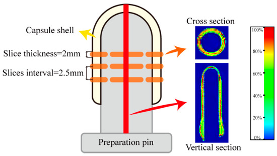 The main parameters of the Numag analyzer were set as follows: FOV (Field-of-view) = 100 × 100 mm, slice thickness = 2 mm, TR = 2000.00 ms, TE = 18.125 ms. In the cross-section of the capsule shell, the number of slices was three. Cross-sectional MRI images were obtained in the position excluding the elbow, while the vertical section was cut from the symmetry line of the capsule, as shown in Figure 6. The MRI images were acquired with an average based on two scan repetitions. Unified mapping and pseudocolor processing were performed to improve the quality of the images.