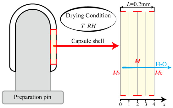 Figure 7 shows a schematic diagram of the HPMC-based hard capsules during drying. Since the inside surface of the capsule is tightly closed to the preparation pin, moisture in the capsule is considered to be transferred only from the inside to the outside surface and finally evaporated into the atmosphere. A previous study of HPMC-based hard capsules [7] has shown that the drying process of the capsule occurs in the falling-rate period when the relative humidity is less than 60%. Moreover, due to the particular thin layer and structure of the capsule, several assumptions have been made [13,47,48], including: