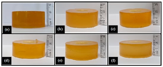 Emulgel-based candy formulations. (a) AP00, (b) AP10, (c) AP15, (d) AP20, (e) AP25, and (f) AP30.