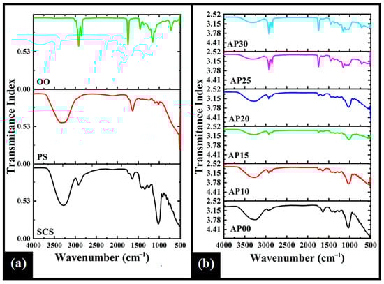 FTIR spectra of (a) raw materials and (b) candy formulations. OO—Olive oil, PS—Pectin Solution, SCS—Sucrose Citric Acid Solution.