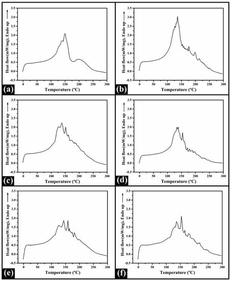 DSC thermograms of emulgel-based candy formulations. (a) AP00, (b) AP10, (c) AP15, (d) AP20, (e) AP25, and (f) AP30.
