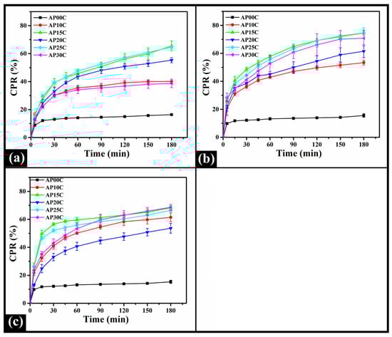 Dissolution profile of the candy formulations containing curcumin (a) CPDR (pH 1.2), (b) CPDR (pH 5.8), and (c) CPDR (pH 7.2).