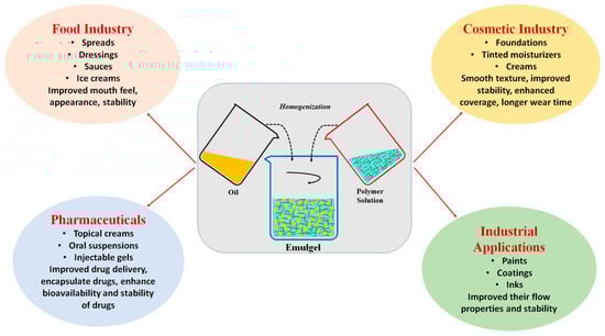 Gels are formed by a three-dimensional network of interconnected particles or molecules that trap liquid within their structure [6,7]. The liquid can be water, oil, or any other solvent, and the particles or molecules that form the network can be polymers, proteins, or other organic or inorganic materials. The materials can interact through chemical or physical processes to create a stable gel structure. Depending on the nature of the materials and the gelation process, various properties, such as texture, stiffness, and water-holding capacity, can be modulated. Hydrogels and organogels are the most commonly used gels in the pharmaceutical, food, and cosmetic industries. However, the limitations associated with them constrain their application for the delivery of specific hydrophobic and/or hydrophilic bioactive compounds. According to Farzami et al. (2019), the hydrophilic nature of hydrogels limits their applicability in delivering hydrophobic molecules [8]. In such scenarios, the emulsification of gels can be an alternative for similar applications. Fabricating emulsion gels/emulgels can be performed by embedding an emulsion into either a gel phase or a pre-gel polymer solution, followed by gelation. The gel network becomes tightly packed during the setting process, forming a network from flocculated droplets, resulting in a firmer and more stable gel. The overall process of emulsification of gels and their probable applications in various sectors was shown in Scheme 1. Eventually, the formulated hybrid systems can provide the advantages of emulsions and hydrogels, i.e., the ability to solubilize hydrophobic and hydrophilic components and good thermodynamic stability. The literature has reported that emulgels can be used as fat replacers in food products, and they can also be used as delivery systems to encapsulate and release bioactive compounds [9]. Emulsion gels combined with animal fat have been suggested to make lower-calorie meat products without sacrificing flavor. By altering sodium mobility and binding behavior, emulsion gels help manage sodium availability and perception, allowing for lower salt content in meat products [10]. Several studies have reported using emulsion gels to deliver bioactive compounds, including curcumin, β-carotene, α-tocopherol, and vitamin A [11]. The use of emulgels as delivery systems helps to improve the controlled release of bioactive ingredients during oral processing and gastric digestion [12,13].