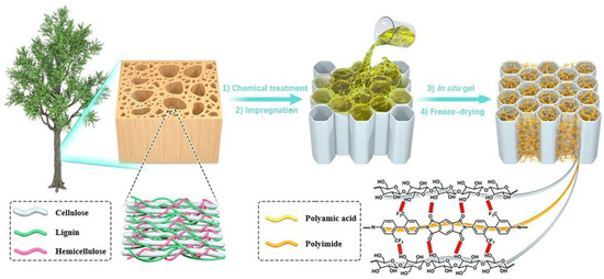 Schematic of the fabrication of wood/polyimide aerogel.