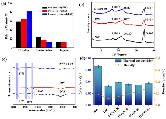 (a) Chemical composition of NW, one-step treated wood, DW; (b) XRD patterns of NW, DW, and DW/PI−60 composite: of 16.1, 22.2, and 34.8 correspond to (101), (002), and (040), respectively [21,25]; (c) FT−IR spectra of the NW, DW, and DW/PI-60 composite; (d) densities and thermal conductivity of the samples.