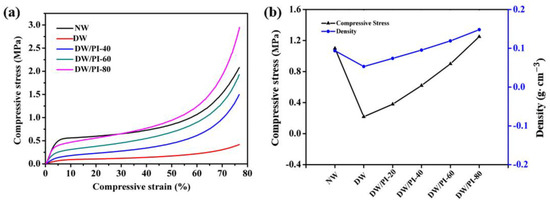 The stress–strain curves of the samples were obtained to evaluate the radical compressive strength of the materials (Figure 4a). The curves can be divided into three stages: linear elasticity, long strain yield, and densification stages. For NW, the strain () of represents the bending of cell walls, thus exhibiting a linear elastic stage. When is up to 40%, the curve changes slightly and the stress plateaus, which can be attributed to the compression of the aligned layered structure. When reached 60%, the radial compressive strength of NW was 1.1 Mpa. After the chemical delignination process, lignin was completely removed from the wood, the hemicellulose content decreased from 24.56% to 12.7% (Figure 2a), and the overall density of wood decreased significantly, and the compressive strength of wood decreased to 0.22 Mpa (), only 20% of its original strength. As a result, the stress of DW decreases by 4.9 times compared with NW at 60% strain, indicating a significant decrease in mechanical strength. With the increased PI content, the radial compressive strength of the wood composite increased from 0.218 MPa of DW to 1.25 MPa of DW/PI-80, as shown in Figure 4b. Moreover, as shown in Table S2 of Supplementary Materials, the wood/PI-80 in this work has advantages of high strength and are much higher than other reported conventional thermal insulation materials, such as wood-waste foam [35], stone wool [36], and EPS foam [26]. Considering that cellulose is the dominant constituent of DW, the mechanism by which PI strengthens wood has two reasons: (1) at the molecular scale, a strong hydrogen bond exists between the PI chain and the hydroxyl groups in the cellulose molecular chains; and (2) the timber orientation structure is retained at the microscale, and the 3D networks of PI are filled into the cavity, resulting in a hierarchical structure, facilitating the provision of skeleton support.