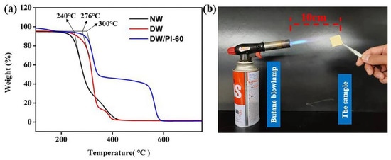 (a) TGA curves (measured in the air: the volume fraction of nitrogen is about 78%, oxygen is about 21%, carbon dioxide is about 0.04%, and the remaining is a rare gas), and (b) the combustion experiment.