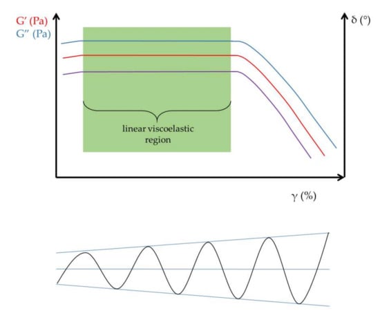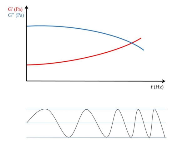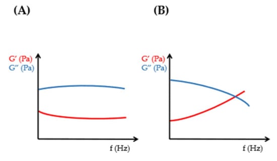 The value and ratio of elastic and viscous moduli are informative for the evaluation of rheological properties and further comparison of viscoelastic formulations [8,9,10,11]. The cross-over point of frequency sweep tests indicates the sol–gel transition of viscoelastic samples (Figure 4).