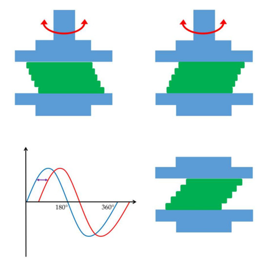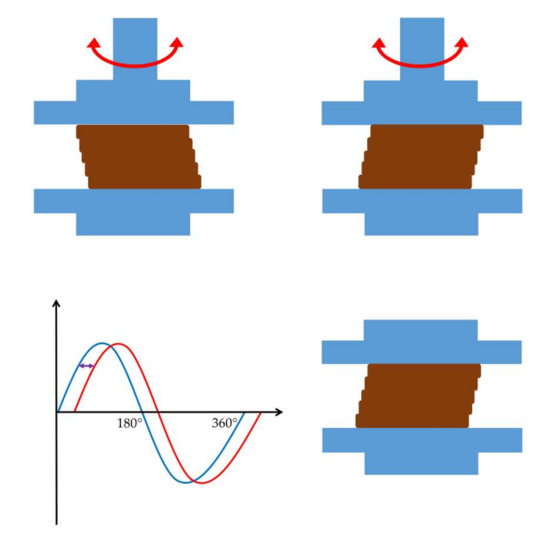 Behavior of viscous materials under oscillatory rheological measurements. The graph shows a relatively large time lag between the blue sine curve of shear strain and the red sine curve of resulting shear stress.